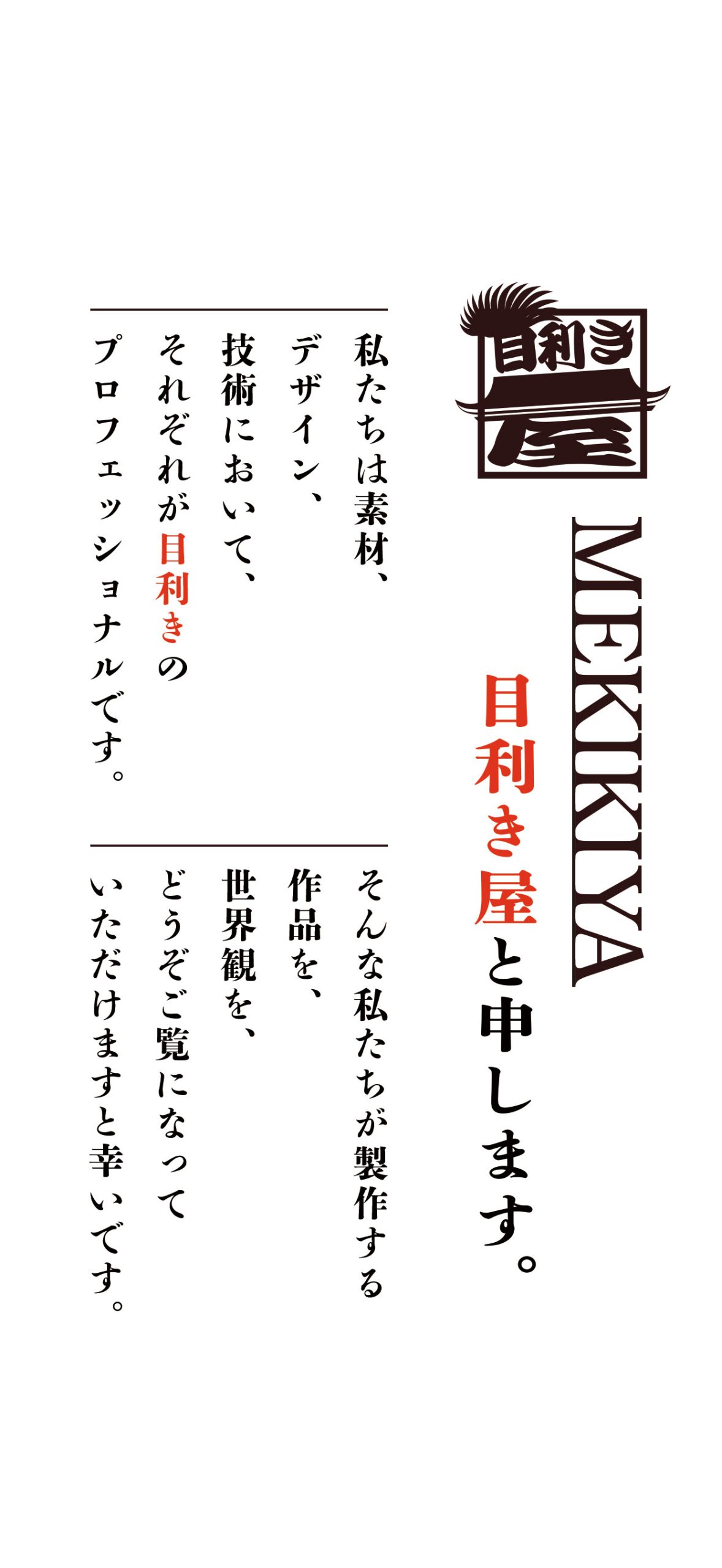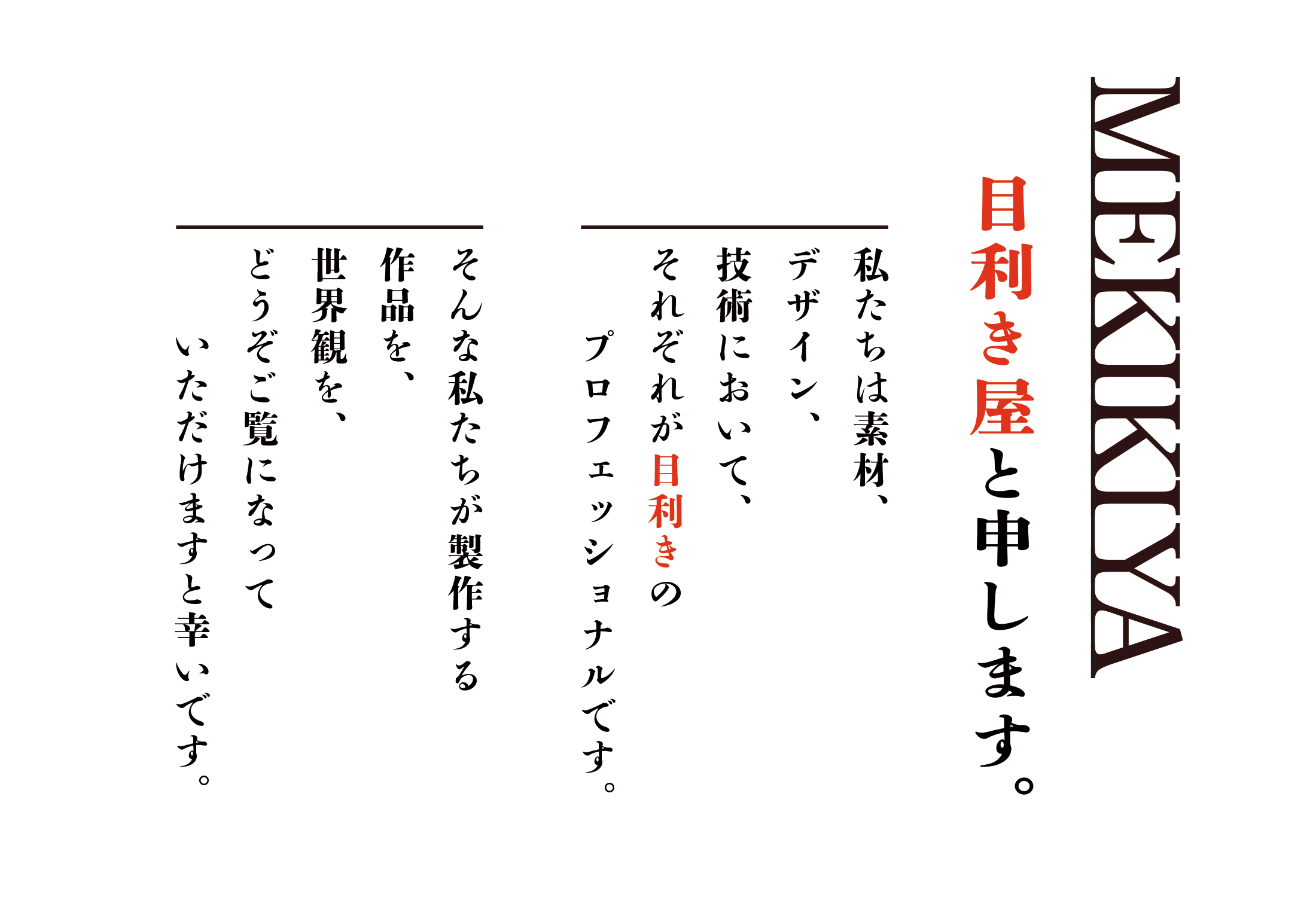 その体制はMEKIKIYA(目利き屋)の中核として保ちつつ、新たな分野で目利き人たちが加わったことにより、今までよりも幅広い作品を製作できるようになりました。
